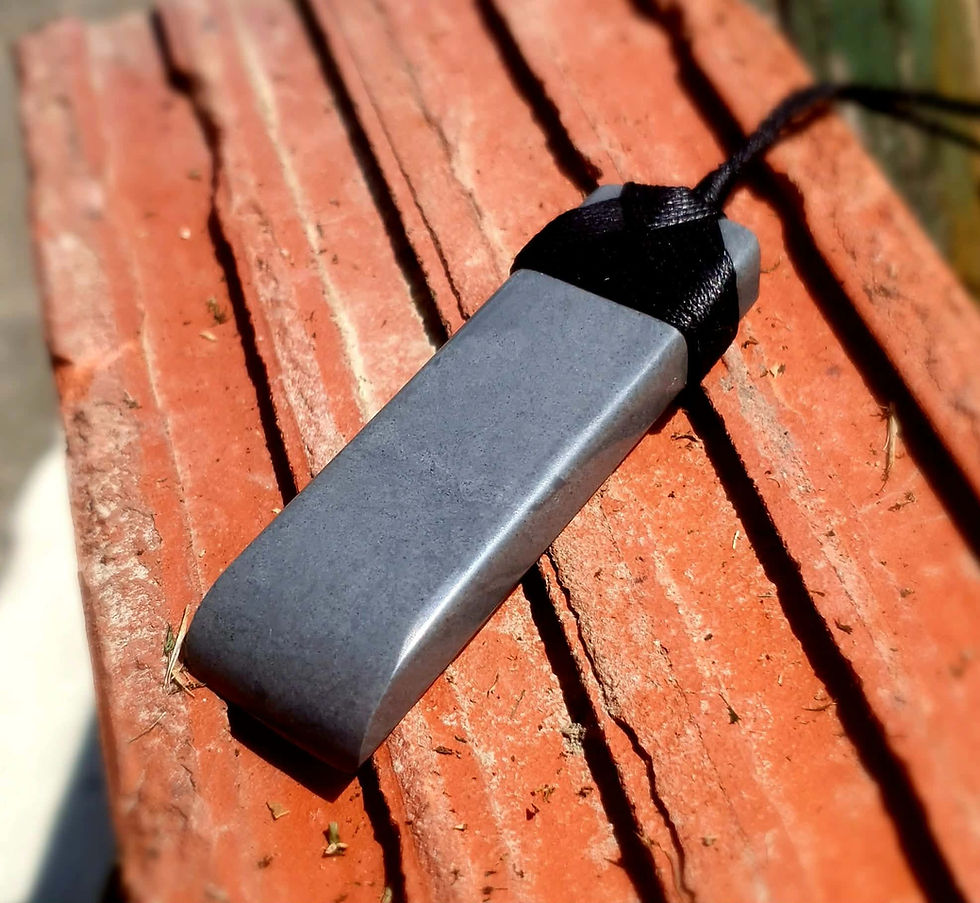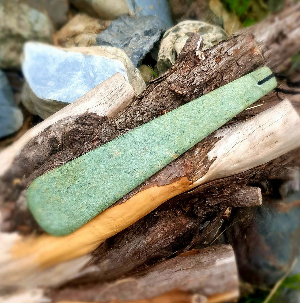 Its classic toki form, with a softly bevelled bottom edge, embodies quiet strength, courage, and grounded determination. Finished with a hand-bound brown cross whip and a brown-and-black braid, this pendant carries a calm balance — bold yet deeply connected to the land.